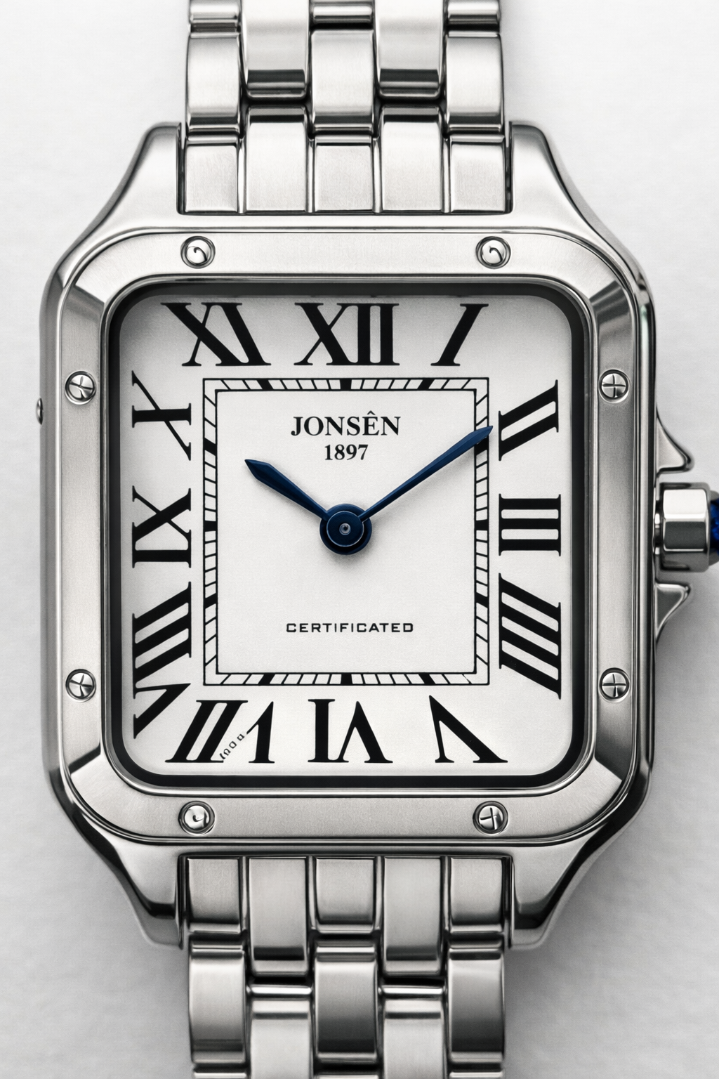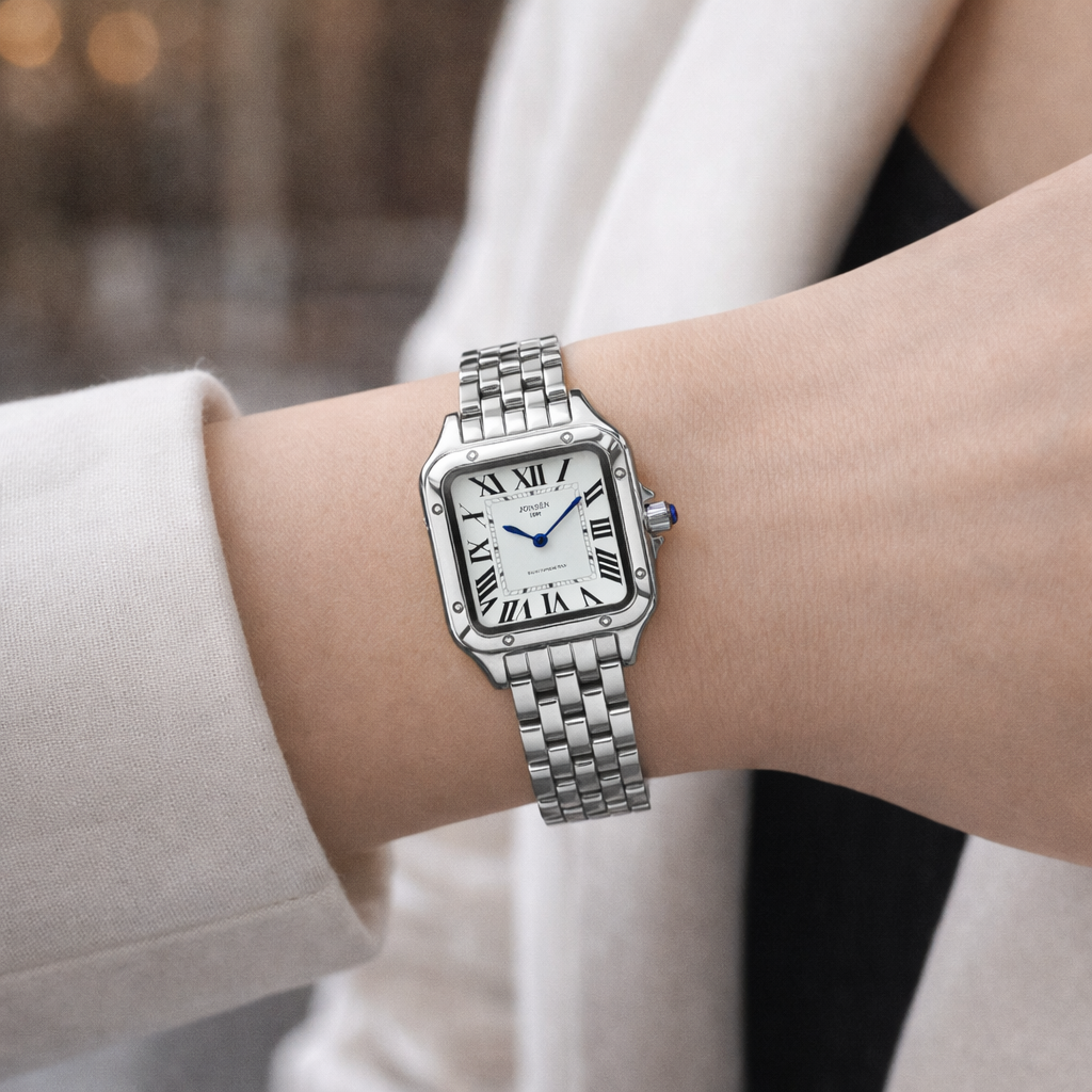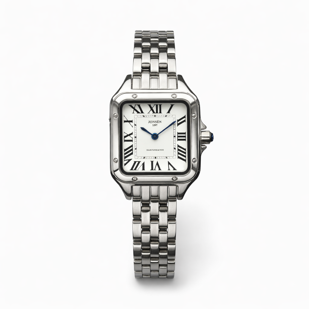 Jonsèn ANGEL, Steel er indbegrebet af tidløs elegance. Et feminint firkantet ur med et rent og stilfuldt udtryk, hvor de klassiske romertal møder køligt, poleret stål.