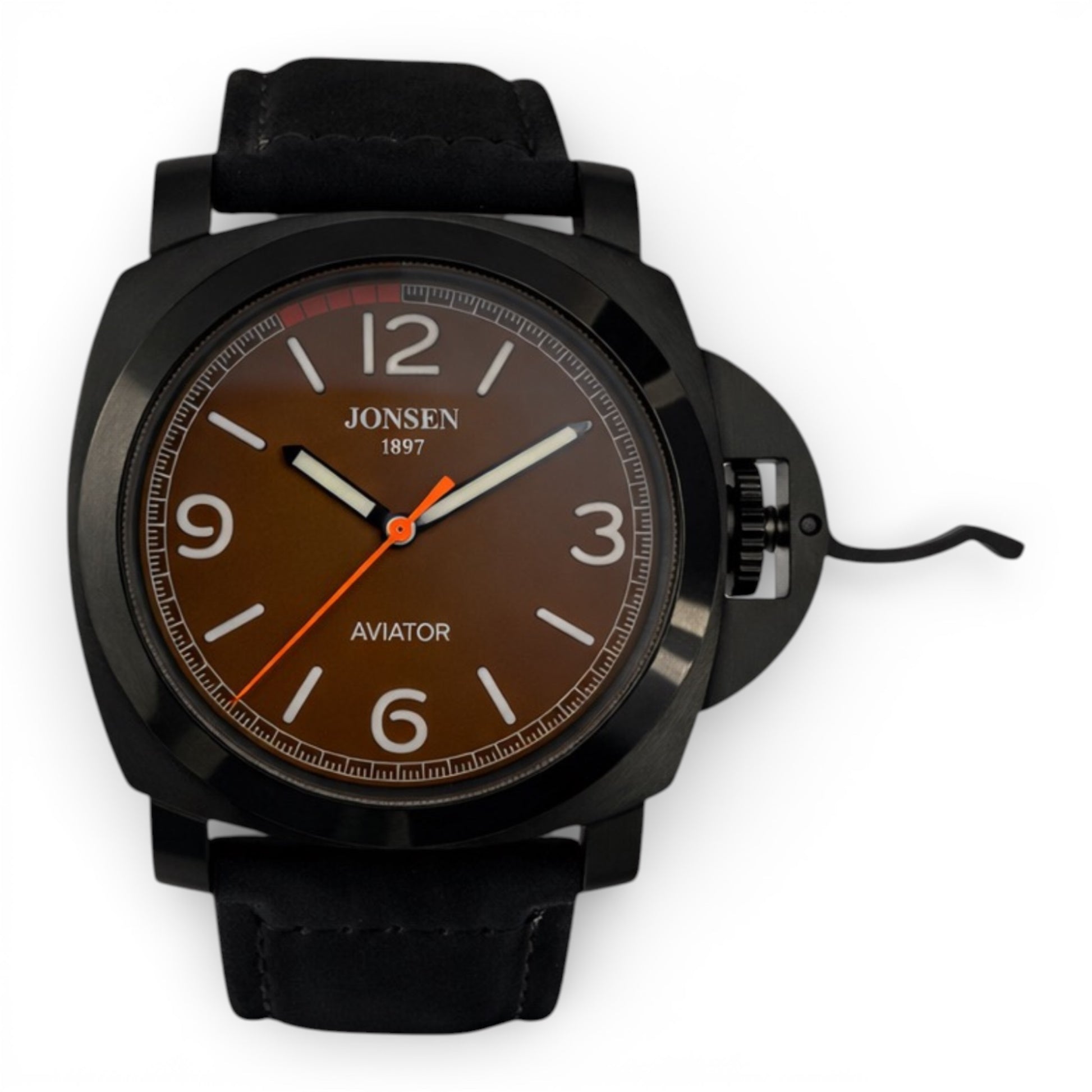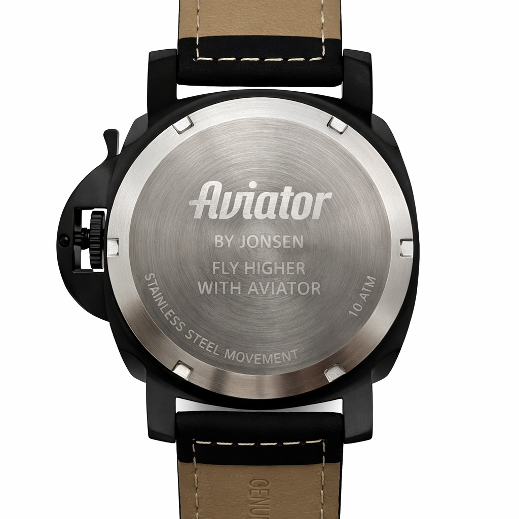Jonsèn AVIATOR er inspireret af klassiske piloture, hvor læsbarhed, robusthed og karakter var altafgørende, Her er designet opdateret med varme brune nuancer og en sort PVD-behandlet stålkasse, som giver et markan og maskulint udtryk.