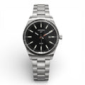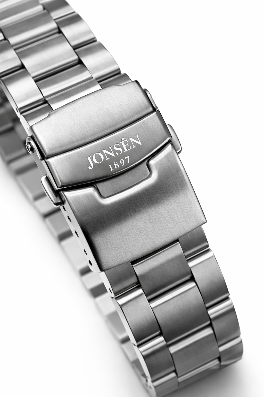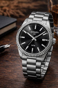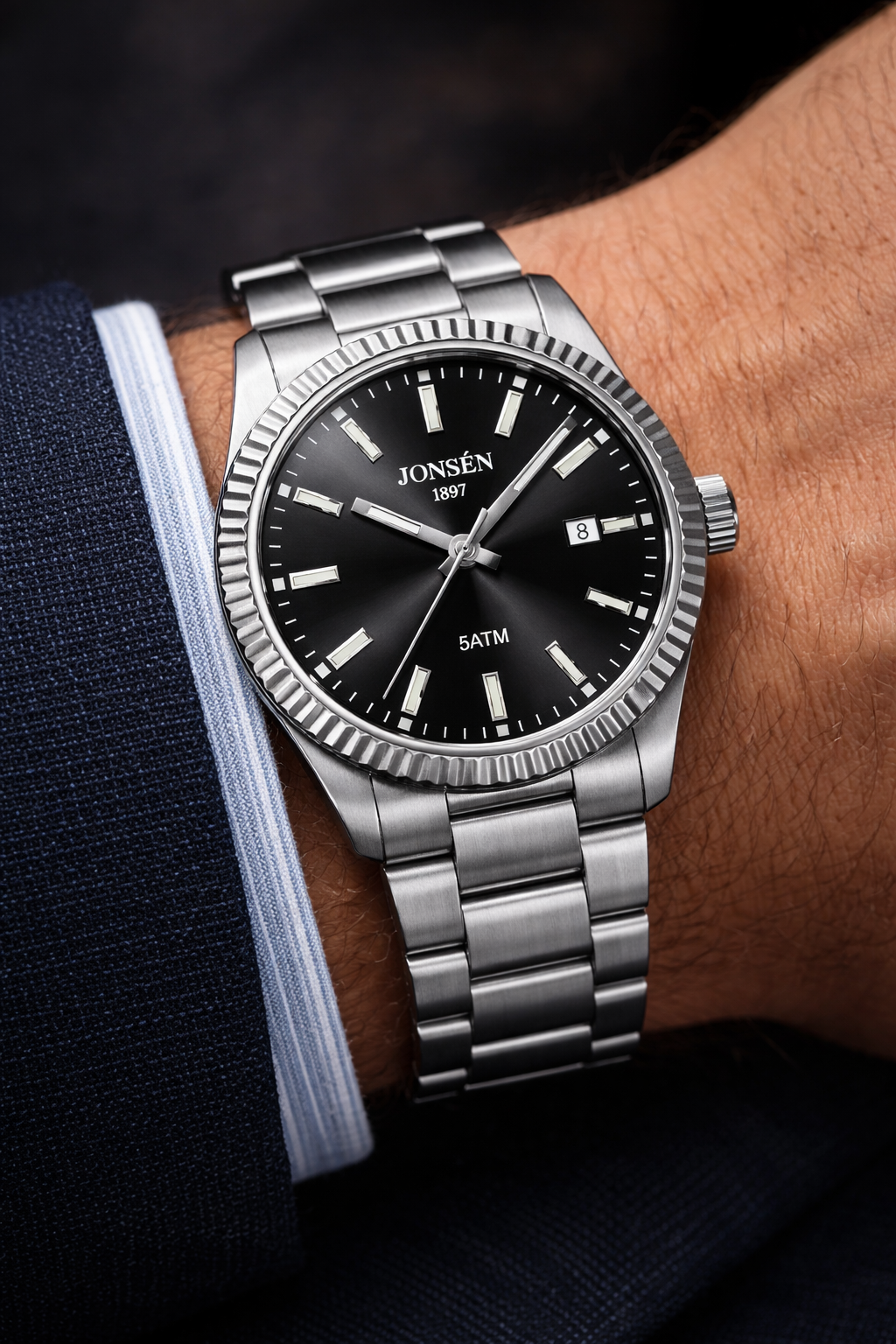 Den børstede stålkasse og den matchende stållænke giver uret et solidt og eksklusivt udtryk, mens den riflede lynette tilføjer et diskret strejf af klassisk luksus. Den sorte sunburst-skive spiller elegant med lyset og fremhæver de markante timemarkeringer og visere.