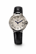 Den lyse urskive med romertal og blå visere giver et elegant, letlæseligt udtryk, mens det buede safirglas beskytter uret mod ridser og giver en smuk dybde i skiven.