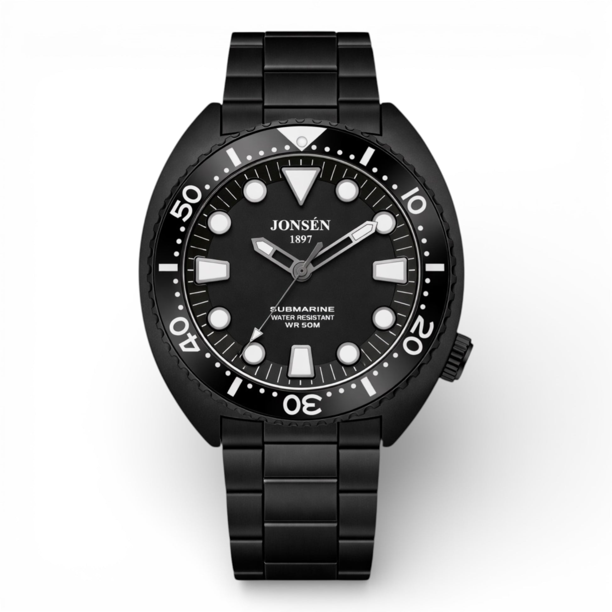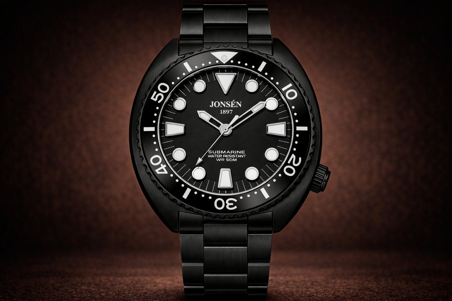 SUBMARINE Black er et kompromisløst herreur skabt til manden, der foretrækker stilren styrke frem for støjende design. Med sit helsorte udtryk og klassiske dykkerinspiration forener uret rå funktionalitet med underspillet elegance.