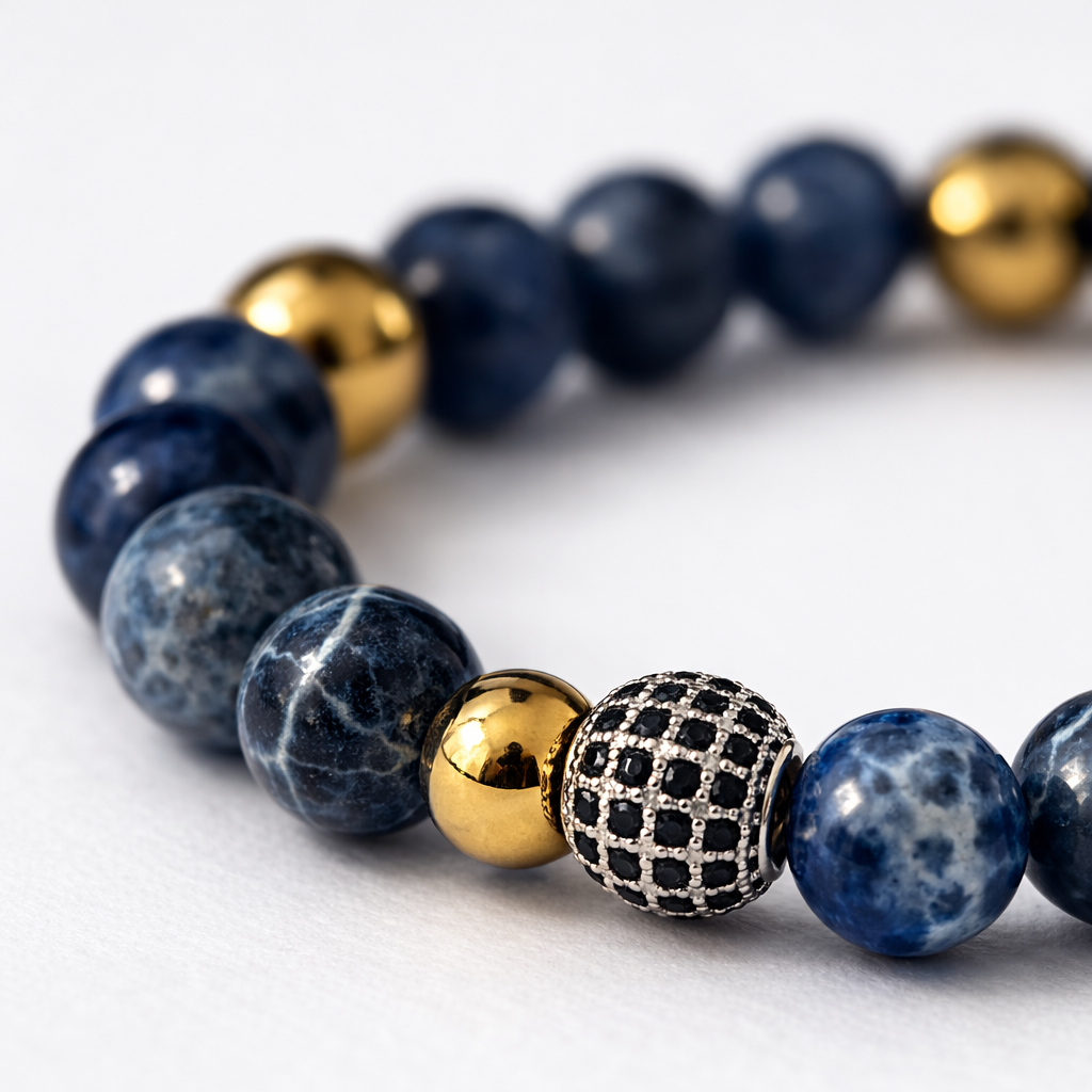 ViCarlo Blu Oro er et eksklusive herrearmbånd forener dybe blå nuancer med rå sort agat og elegante guldfarvede stålperler. Kombinationen af matte og polerede overflader skaber et moderne og maskulint udtryk, mens den pavebesatte stålperle tilfører et diskret, luksuriøst touch.