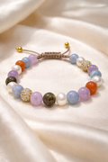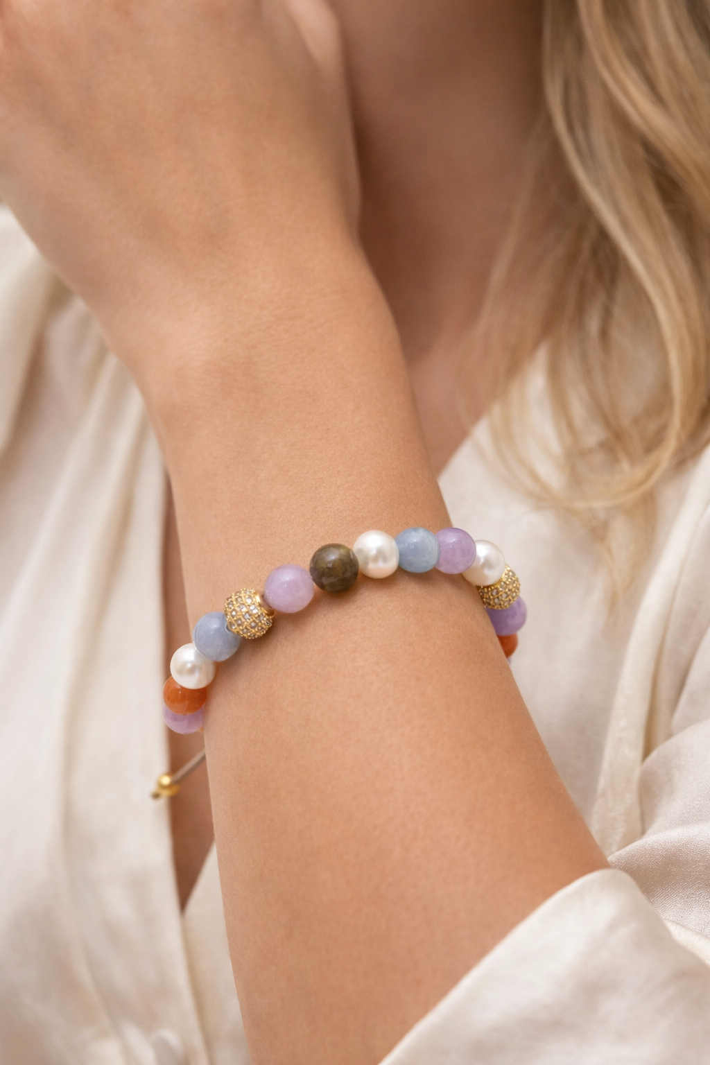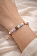 ViCarlo Pastello Oro er et feminint og farverigt armbånd sammensat af smukke natursten i bløde pastelfarver, herunder ametyst, lys blå agat, labradorit og karneol. De guldfarvede pavebesatte perler tilfører varme og eksklusivitet, som fuldender det elegante design.