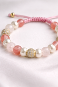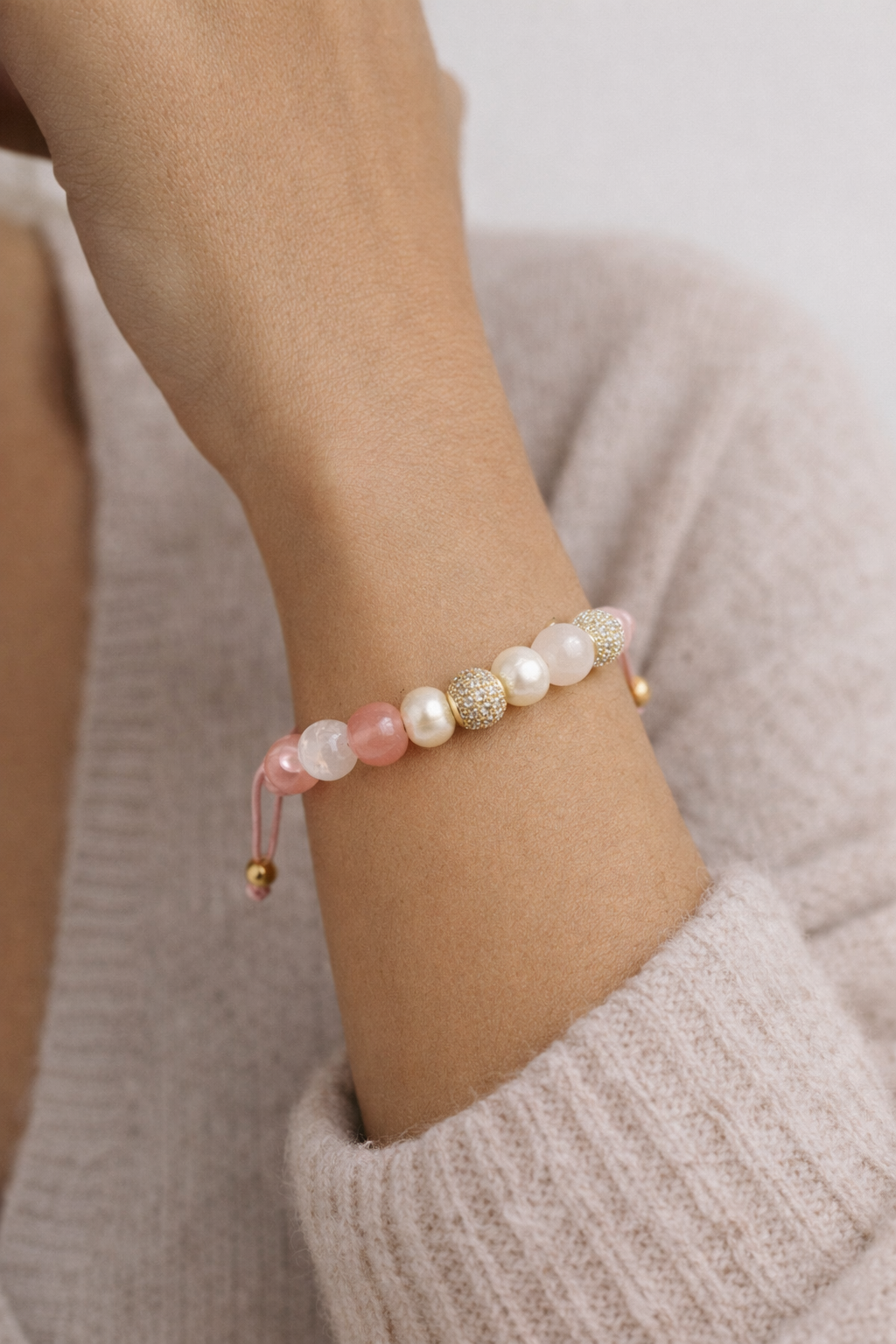 ViCarlo Rosa Perla er et feminint og elegant armbånd, hvor bløde rosatoner møder klassiske ferskvandsperler og eksklusive guldfarvede pavédetaljer. Kombinationen af rosa quartz og hindbær quartz skaber et varmt, romantisk farvespil, mens perlerne tilfører tidløs elegance.