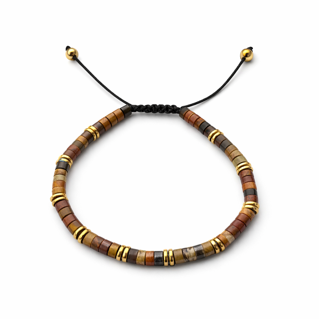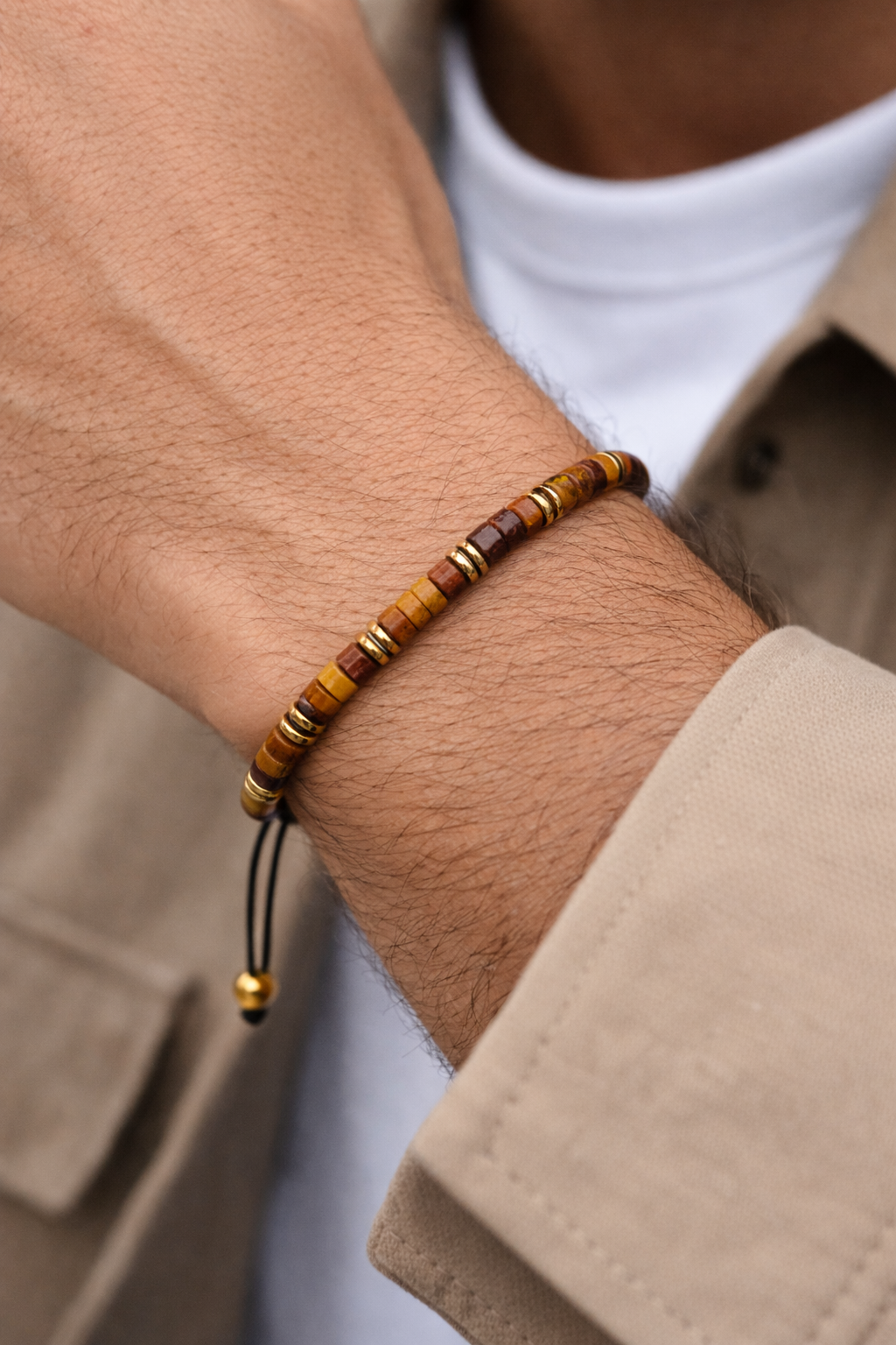 ViCarlo Verona er inspireret af varme gyldne nuancer og italiensk elegance. Armbåndet kombinerer natursten i toner af amber, karamel og brun med diskrete guldfarvede spacers, der giver et eksklusivt og maskulint udtryk.